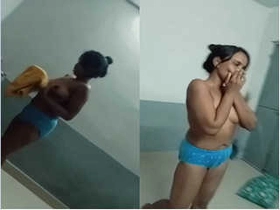 A shy Indian girl takes a nude bath in a public bathroom