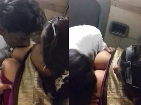 Aunty gives her boobs to her lover and kisses him on the lips in the train's bathroom
