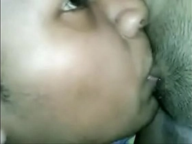 Hindi porn video featuring a natural Indian bhabhi giving a blowjob to a young man behind the camera